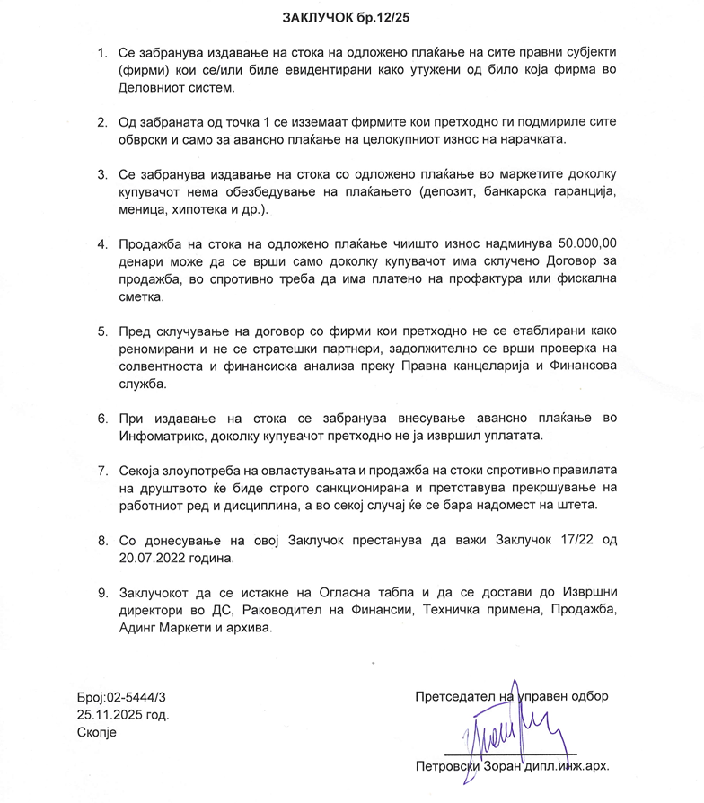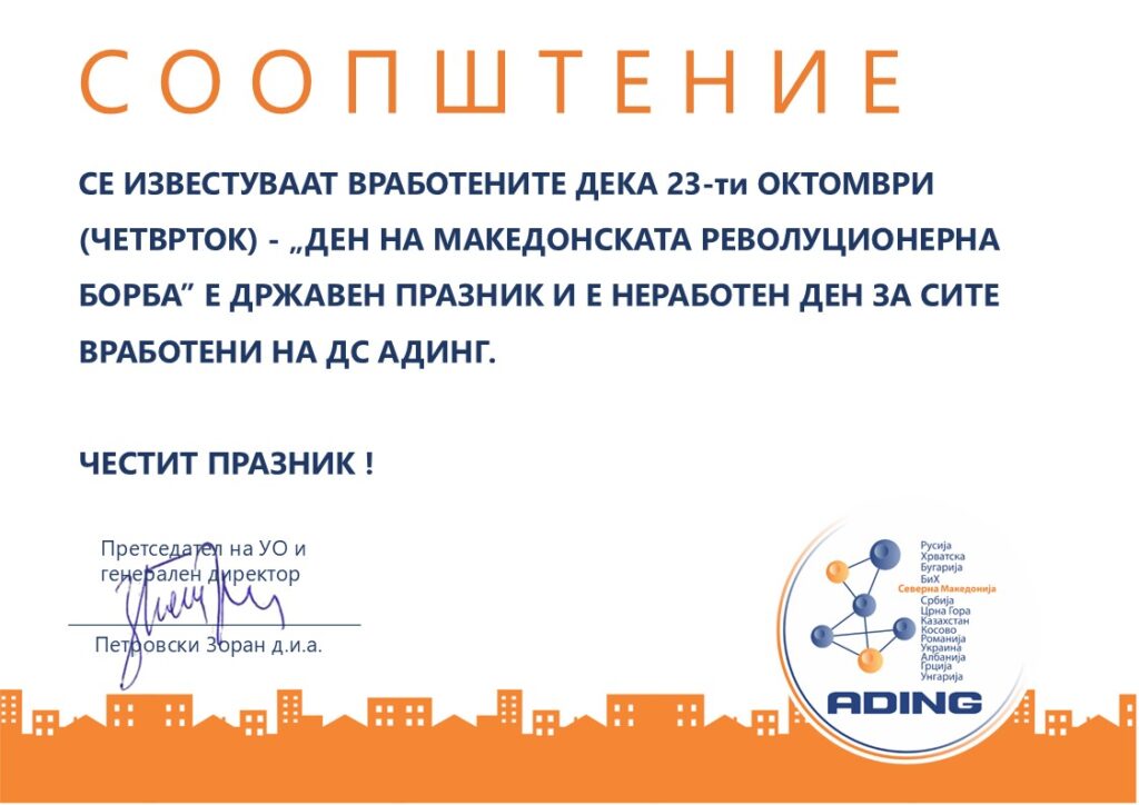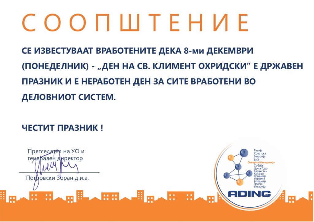 Се известуваат вработените дека на ден 08.09.2025 ( ПОНЕДЕЛНИК ) се празнува државниот празник „ Ден на независноста “